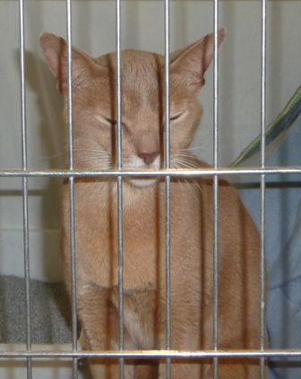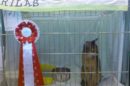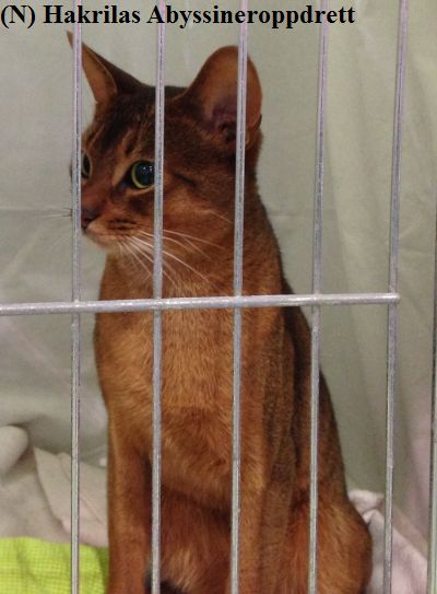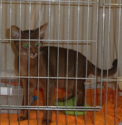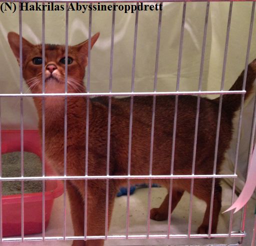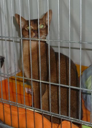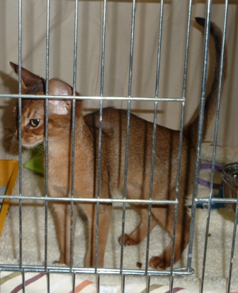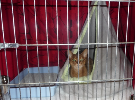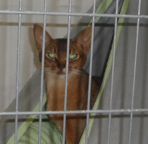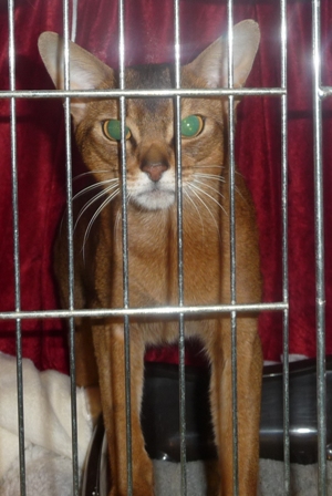 Abyssinerhannkatten Astrakan Gyllenkrok i utstillingsburet sitt:)