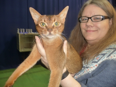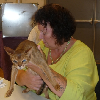 På SWS ble alle katterasene presentert, og jeg skulle fortelle om abyssinere. Her er May Britt (min rasekattvenninne) med Estilo før presentasjonen av abyssinerne :)